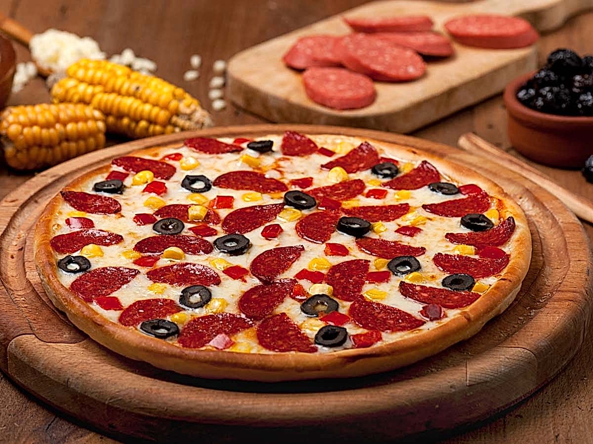 Wheat flour, water, cheese (pasteurized cow’s milk, salt, cheese culture, rennet), tomato paste (tomato puree), chicken sausage (chicken meat and fat, spice mix, salt), chicken salami (chicken meat and fat, water, sunflower oil, spice mix, soy protein, potato starch, salt), corn, olives, chicken sausage (chicken meat and fat, water, sunflower oil, spice mix, soy protein, potato starch, salt), pepper, yeast, sunflower oil, sugar, salt, spice mix (irradiated spices used).